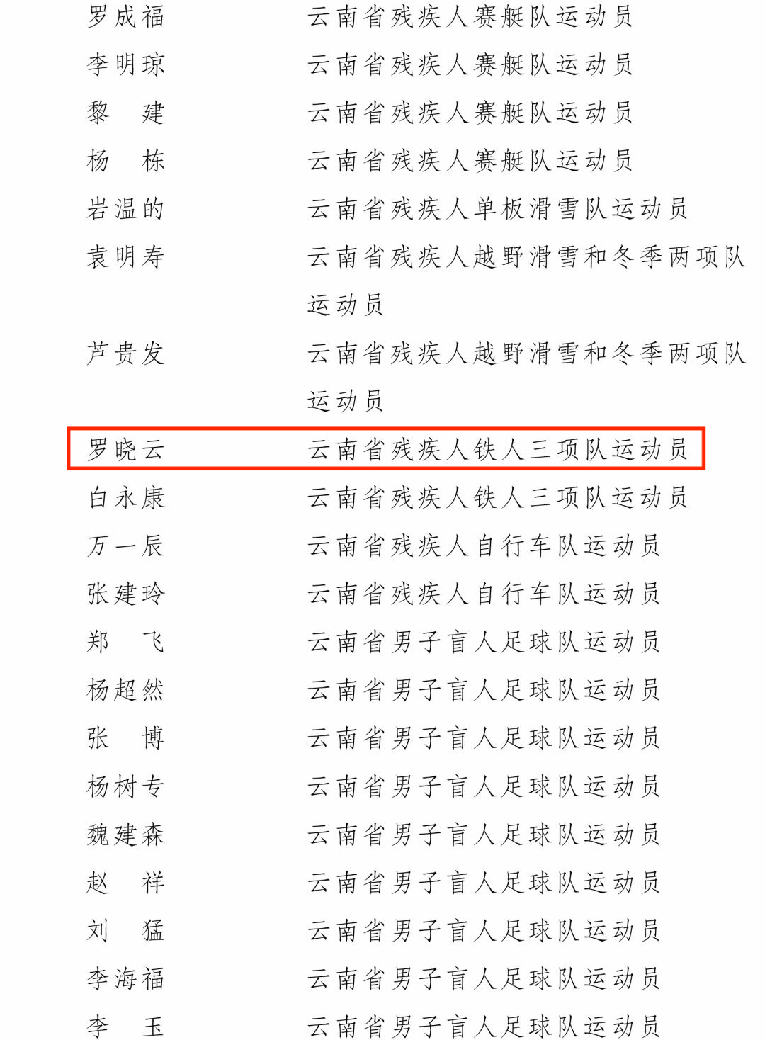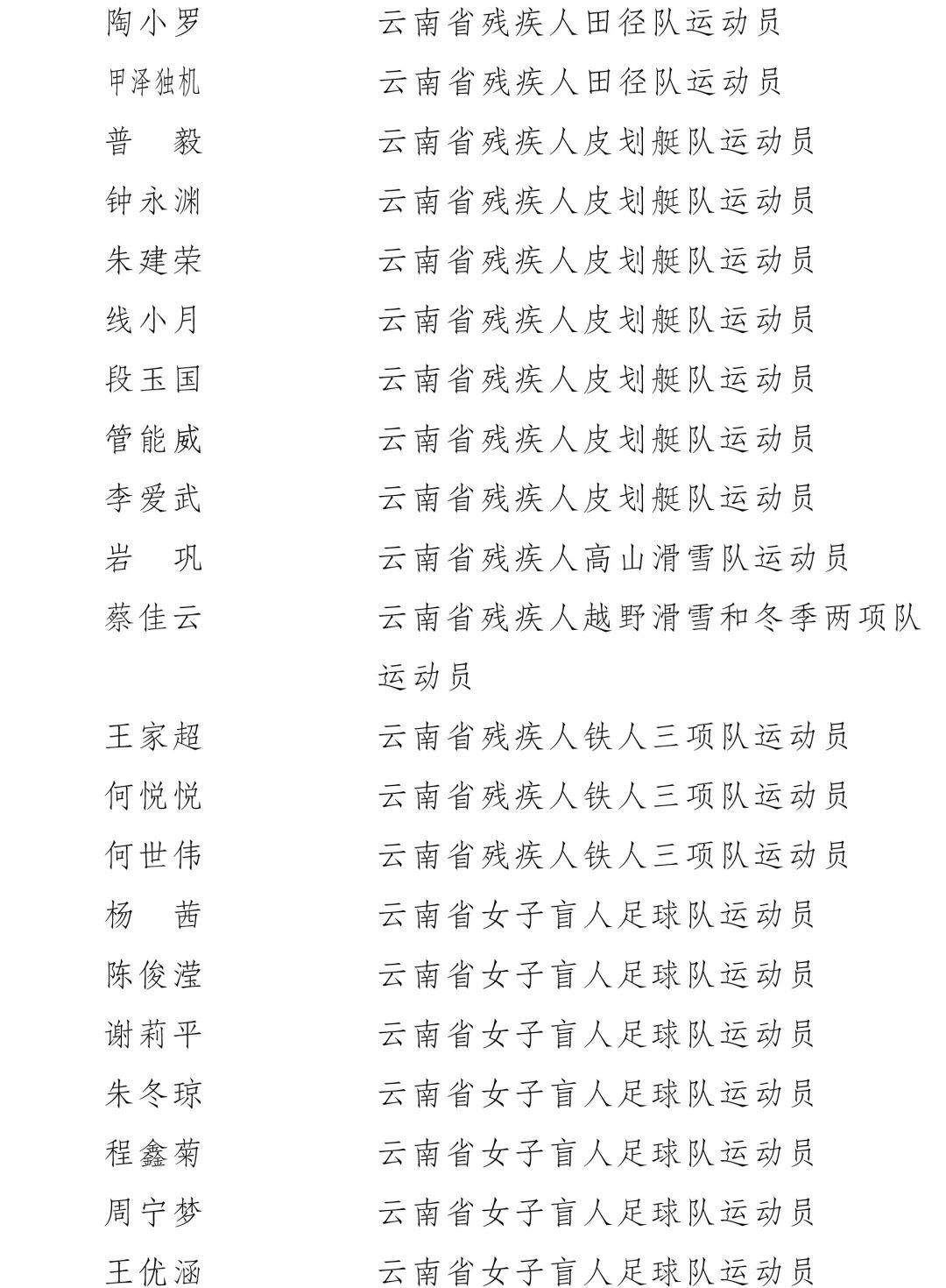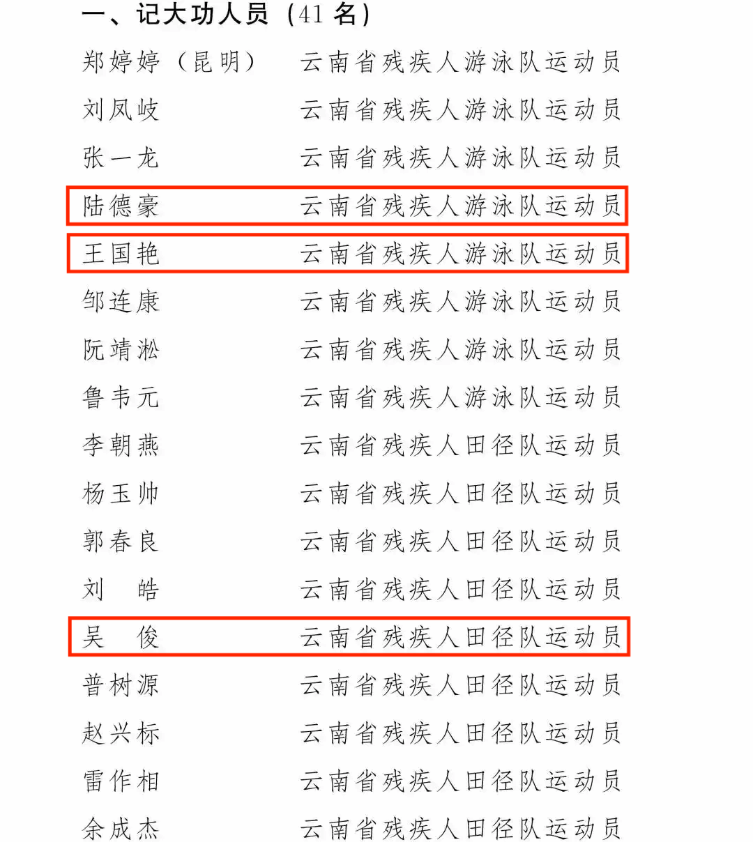 近日,为表彰在全国第十二届残疾人运动会上我省残疾人运动员的优异成绩和历史性突破,云南省人民政府发布了《关于给予我省参加全国第十二届残疾人运动会运动员和教练员奖励的通报》,全省144名残疾人运动员和教练员获得奖励,其中陆德豪、王国艳、吴俊3名保山籍运动员获记大功奖励,王丹、李维熙、罗晓云、王硕、李艳华、杨光泽6名保山籍运动员获记功奖励。
