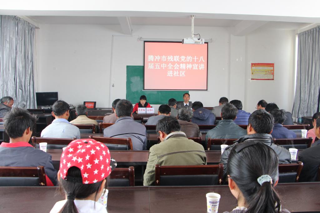 为深入学习宣传贯彻党的十八届五中全会精神和省、市重要战略部署,引导全市广大干部群众进一步统一思想,凝集力量,推动腾冲经济社会又好又快发展。1月22日,腾冲市残联邀请“艾思奇百姓宣讲团”郭胜教授深入界头镇沙坝地社区开展十八届五中全会精神宣讲,残联班子及党员干部、镇残联专干及宣传干事、两社区村三委干部、村民小组长、部分党员代表及挂钩扶贫户,共60余人参加。