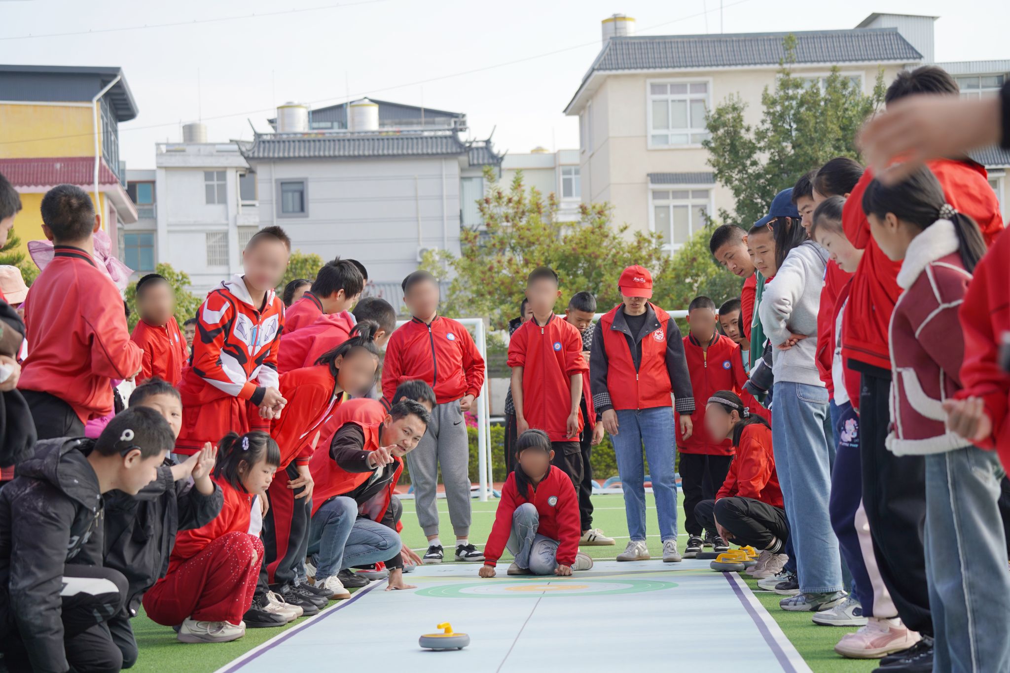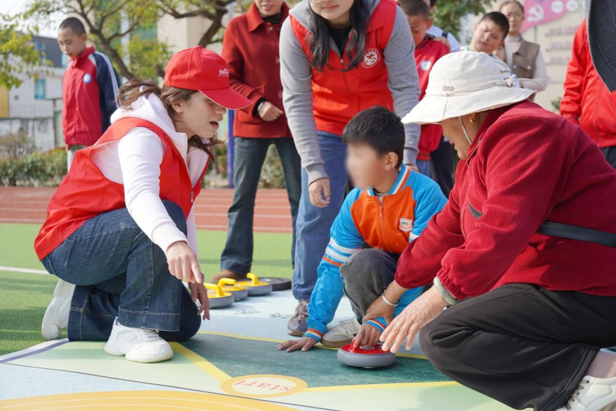 随着一声令下,体验活动正式拉开帷幕。在老师和志愿者的耐心引导和陪伴下,孩子们轮流上场,手握冰壶,瞄准、推壶……每一个动作都做得格外认真。尽管有些孩子在动作协调上存在困难,但在一次次尝试和鼓励中,他们逐渐掌握了要领,每当冰壶稳稳滑入得分区,现场便爆发出阵阵掌声和欢呼声。老师们和志愿者始终陪伴在孩子们身旁,用温暖的话语和实际行动给予支持。不一会儿,越来越多的孩子主动排队参与,现场气氛热烈而有序。冰壶滑过地面的声音、孩子们兴奋的笑声、加油助威的呐喊声交织在一起,汇成了一曲动人的爱的交响乐。
