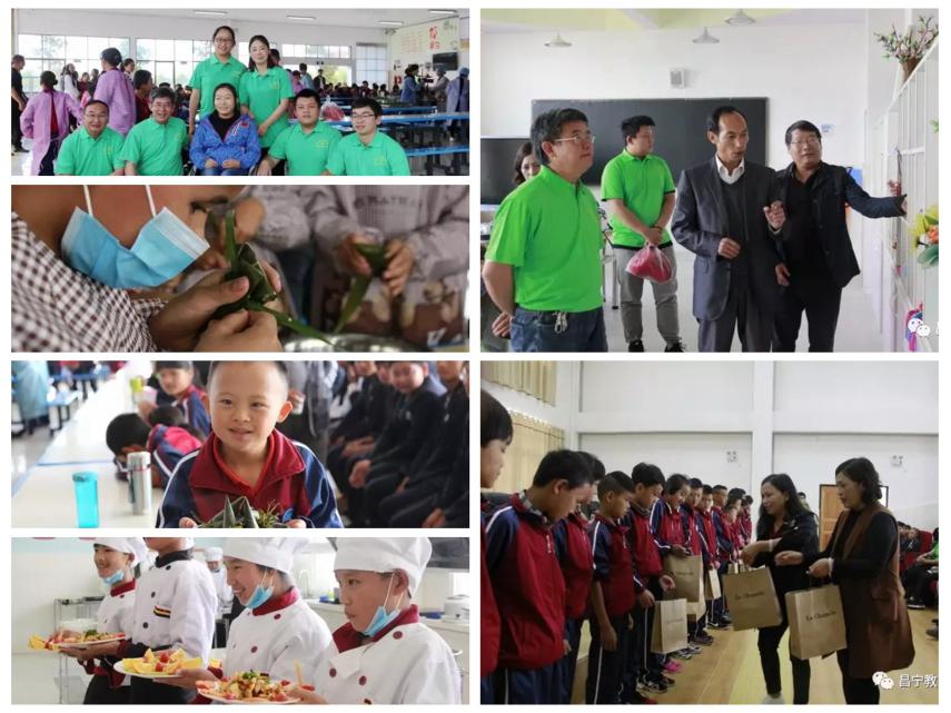 开幕式结束后,所有师生与嘉宾都到餐厅开始包粽子。整个餐厅弥漫着欢声笑语,气氛热闹非凡。接下来是烹饪组的成果展示,三个组的同学在老师的指导下完成了蒜香洋芋、营养“三鲜汤”和水果拼盘的制作。看着孩子们笨拙、艰难却认真的动作,参与活动的嘉宾十分感叹:现在的孩子都是被长辈捧在手心里,很多都不会做饭,没想到这些特殊的孩子能做得这么好!