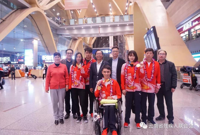 10月15日晚,参加第三届亚残运会的5名云南籍运动员和两名领队载着为国家争取的荣誉回到昆明。此次我省有5名运动员入选国家队参加本届运动会,最终取得了3金4银5铜的佳绩。其中,两名来自保山的运动员王艳萍、王丹则斩获了3银1铜的好成绩。应省残联党组、理事会的安排,省残联党组成员、副理事高利生带领机关办公室、工会、体育指导中心等相关部门负责人到机场迎接,在机场举行了简朴而热烈的欢迎仪式。