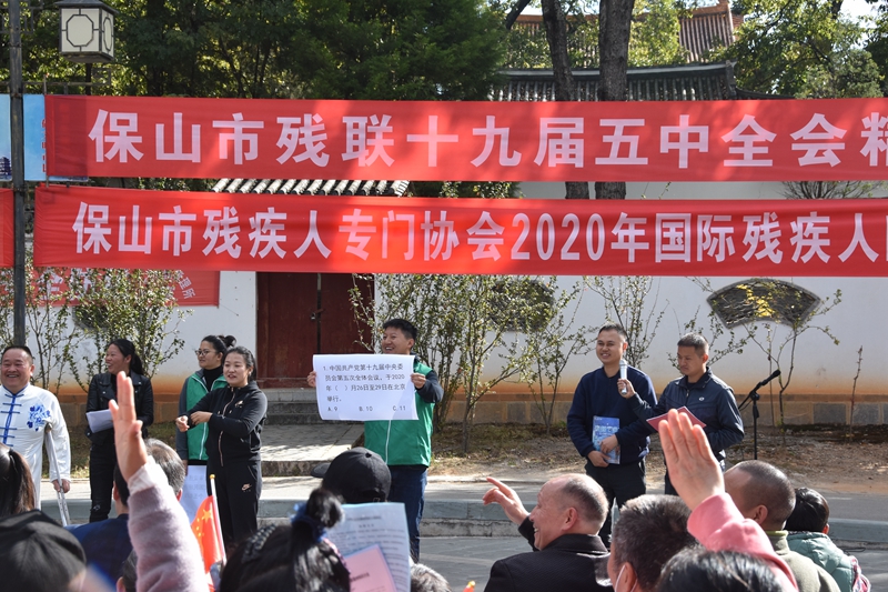 当天的活动还组织残疾人朋友开展了党的十九届五中全会知识竞答和文艺活动。为全力支持“国际残疾人日”活动的开展,保山市残联党支部、保山市公益协会积极为残疾人朋友提供志愿服务。在保山市残联理事长陈乐带领全体活动人员齐声高唱《我和我的祖国》深情的大合唱中,将残疾人弟兄姐妹“爱党爱国爱家乡”的浓烈情感推向高潮。