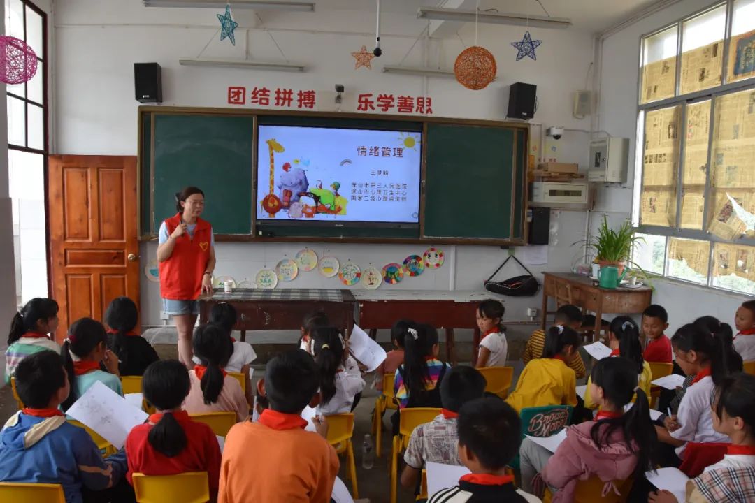 在鸡飞小学由保山市第三人民医院、保山市心理卫生中心国家二级心理咨询师王梦晗给鸡飞小学3、5年级40余名同学讲了一节生动、有趣、别开生面的精神卫生知识课。通过这堂课同学们认识到了,什么是健康?什么是情绪?情绪特别是负面情绪对学习、生活的影响以及要怎样管理自己的情绪等知识。小朋友们纷纷表示今后一定要管理好自己的情绪,每天都要用积极、乐观的心态去面对学习和生活的挑战。