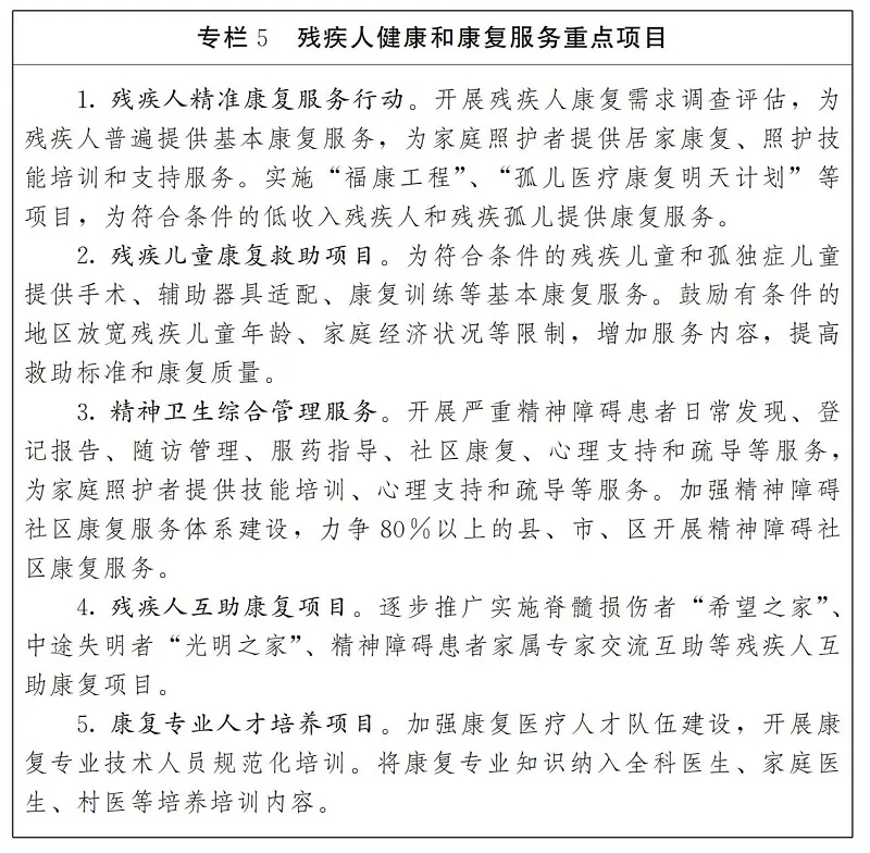 3. 提升残疾人康复服务质量。将残疾人康复服务纳入社区公共服务体系。持续实施残疾人精准康复服务行动,完善残疾人基本康复服务目录,规范服务内容和标准。落实残疾儿童康复救助制度,提高服务质量和保障水平。加强残疾儿童早期干预,大力推进0—6岁儿童残疾筛查、救治和康复,建立筛查、诊断、康复救助衔接机制,健全综合医院康复医学科、康复专科医院、基层医疗卫生机构三级康复医疗服务体系。加强残疾人基础服务设施建设,将康复机构设置纳入基本公共服务体系规划,建立完善州市、县级残疾人康复中心或者托养中心。推进医康结合、康教融合、康复救助与医疗保障衔接。加强残疾人康复机构规范化建设和评估,充实职业康复、社会康复、心理康复等服务功能。支持儿童福利机构增加和完善康复功能,提高康复医疗服务能力。加强社区康复,配备社区康复员,推广残疾人自助、互助康复。开展精神卫生综合管理,加大对严重精神障碍患者的救治救助力度,广泛开展精神障碍社区康复。加强残疾人康复人才培训和培养,完善康复人才职称评定办法,形成康复专业人才培养长效机制。开展残疾人康复专业技术人员规范化培训,支持规范化培训基地建设。