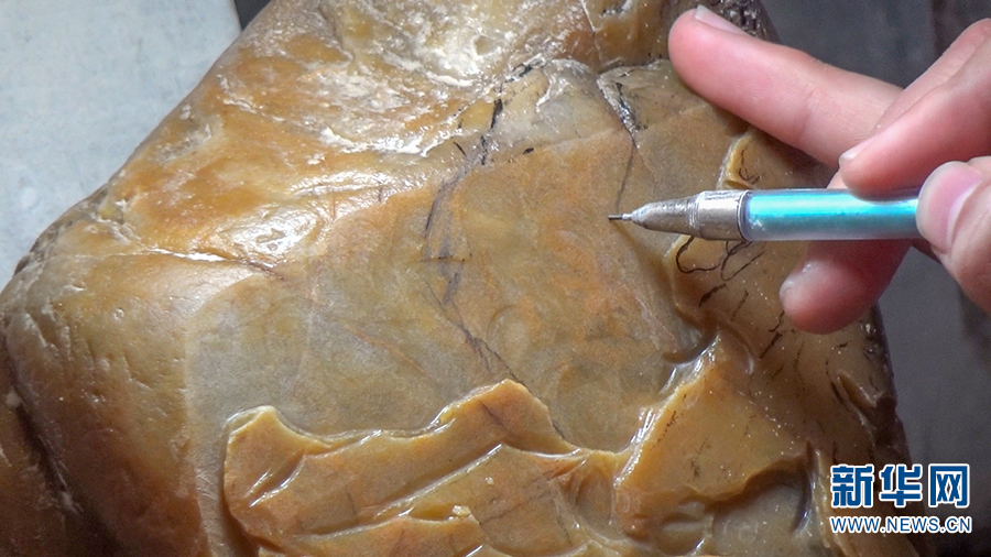 残疾人玉雕培训班学生马显梅创作的黄龙玉作品《溪涧》(3月9日摄)。新华网发(杨连明 摄)