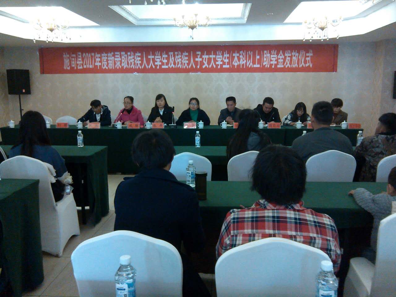 1月29日中午,施甸县在施甸大酒店二楼会议室举行2017年度考取大中专院校残疾学生和二本以上残疾人子女助学金发放仪式,政府、政协、财政局、教育局、民政局、团委、妇联、红十字会等领导参加了助学金发放仪式。