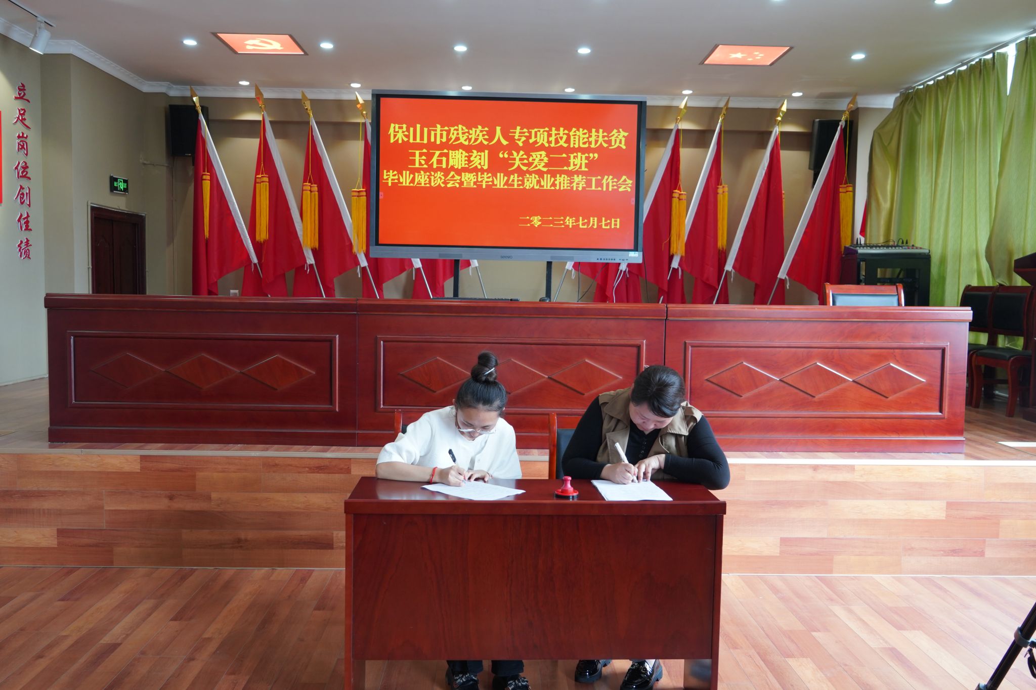 为深入推进市残联与龙陵县职业高级中学、华盛玉雕基地联合开办的残疾人专项技能玉石雕刻班高质量发展,实现高质量就业,推动全社会更加关心关爱残疾人,7月7日,保山市残疾人专项技能玉石雕刻班“关爱二班”毕业座谈会暨毕业生就业推荐工作会议在龙陵县职业高级中学召开。