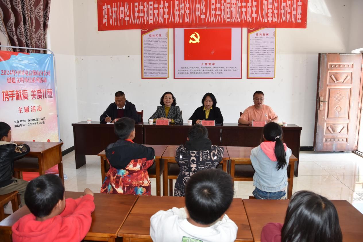 市残联领导结合近年留守儿童关爱救助保护工作实践,宣讲了《未成年人保护法》《预防未成年人犯罪法》《反家庭暴力法》《家庭教育促进法》等法律法规,希望镇村两级进一步关心关注留守儿童,给予他们更多的关爱救助;希望学校当好学校家长,关注留守儿童心理健康;希望学生和家长认真学习法律法规,受到侵害时要懂得用法律保护自身权益;希望留守儿童听党话、感党恩、跟党走;希望各级各部门加强沟通协调,整合项目资源,形成工作合力,加强关爱救助,共同营造留守儿童健康成长、勤奋学习的良好环境。法治宣传教育中,保山市残联协调保山电信分公司捐赠鸡飞村“留守儿童之家”工作经费1.5万元,捐赠鸡飞村小学价值3000元的学习用品和体育用品,开展了学雷锋志愿服务活动,发放宣传资料100余份。