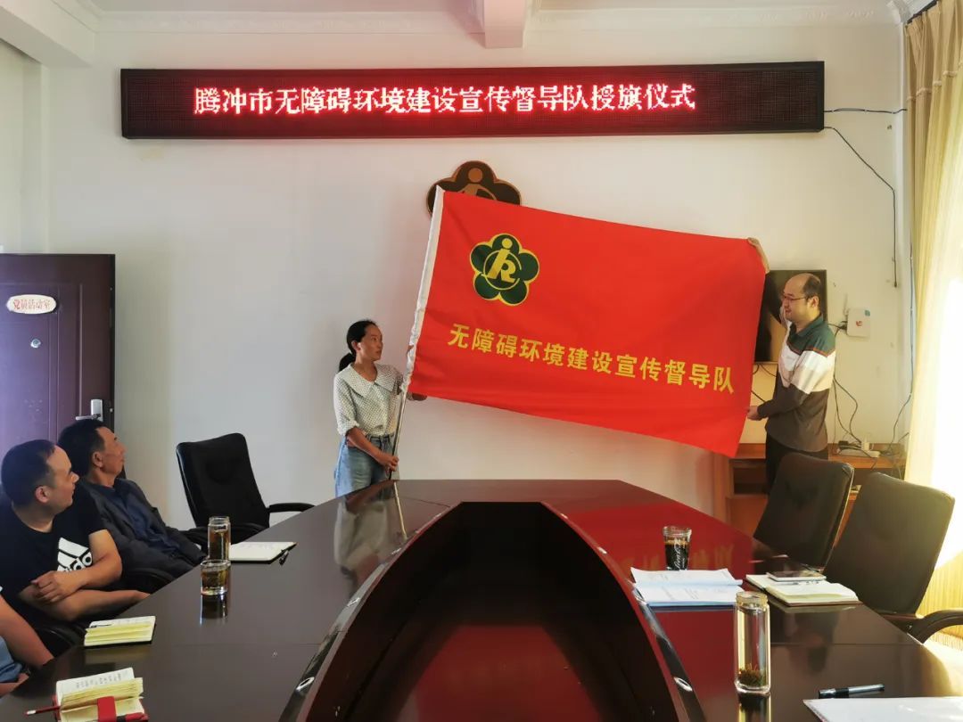 腾冲市首批5名督导员分别由5各残疾人专门协会主席兼任,授旗仪式上,市残联理事长马智宣读了关于成立无障碍环境建设宣传督导队的通知,介绍了成立无障碍环境建设宣传督导队的目的和意义,督导员队伍的建设管理、督导工作的内容方式以及督导工作队的后勤保障等相关事宜。