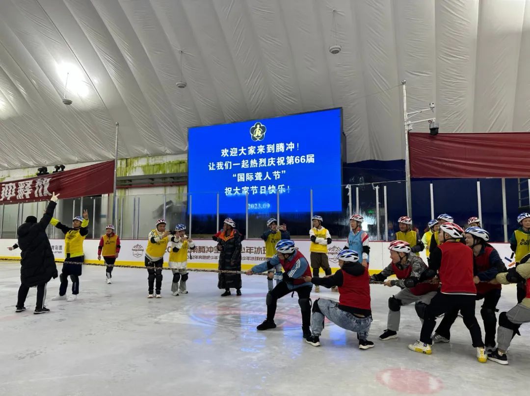 活动第一项是在腾冲启迪冰上运动中心进行冰上项目体验。活动通过冰上拔河、打冰球、冰上龙舟赛、冰上火烈鸟等项目活动,让聋人朋友发挥团队意识,参与意识,积极主动融入各项体育活动,强身健体,弘扬冬残奥会精神,推广残疾人冰雪项目。